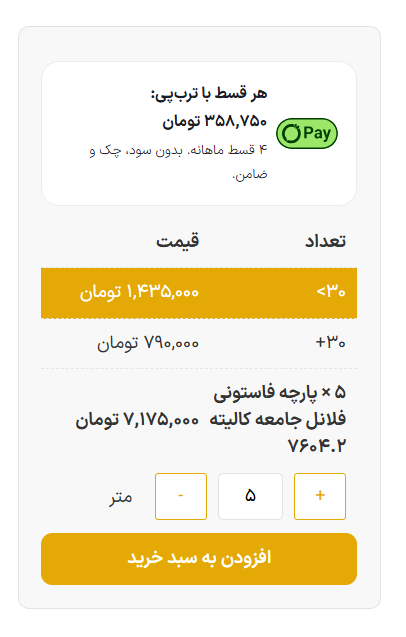 همانطور که در تصاویر مشاهده میکنید بلافاصله پس از افزایش متراژ به بالاتر از 30 متر قیمت محصول طبق تعرفه قیمت عمده محاسبه میگردد.